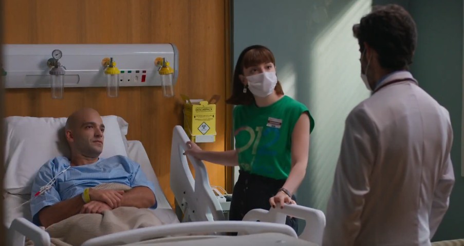 Solange aparece visitando Afonso Roitman (Humberto Carrão) no hospital, mas o volume da barriga de gravidez parece “sumir”, como se alguém tivesse se esquecido de fazer a caracterização correta de Wegmann.