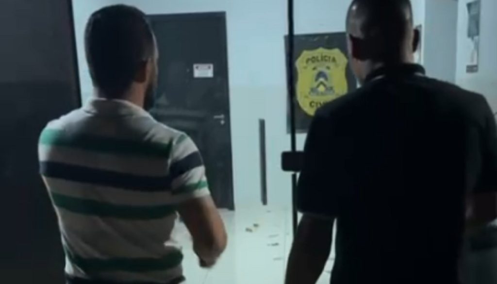 Nas imagens divulgadas pela Polícia Civil, o suspeito aparece entrando em uma delegacia. O vídeo com o rosto dele borrado foi enviado pela Secretaria de Segurança Pública (SSP).
