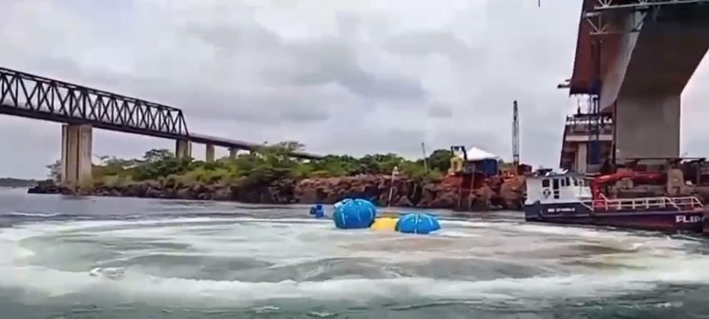 Um caminhão VOLVO/FH 500 que estava no fundo do rio Tocantins desde o desabamento da ponte Juscelino Kubitschek de Oliveira, em dezembro de 2024, começou a ser retirado da água. O veículo foi içado com ajuda de balões, após nove meses da tragédia que deixou mortos e desaparecidos.